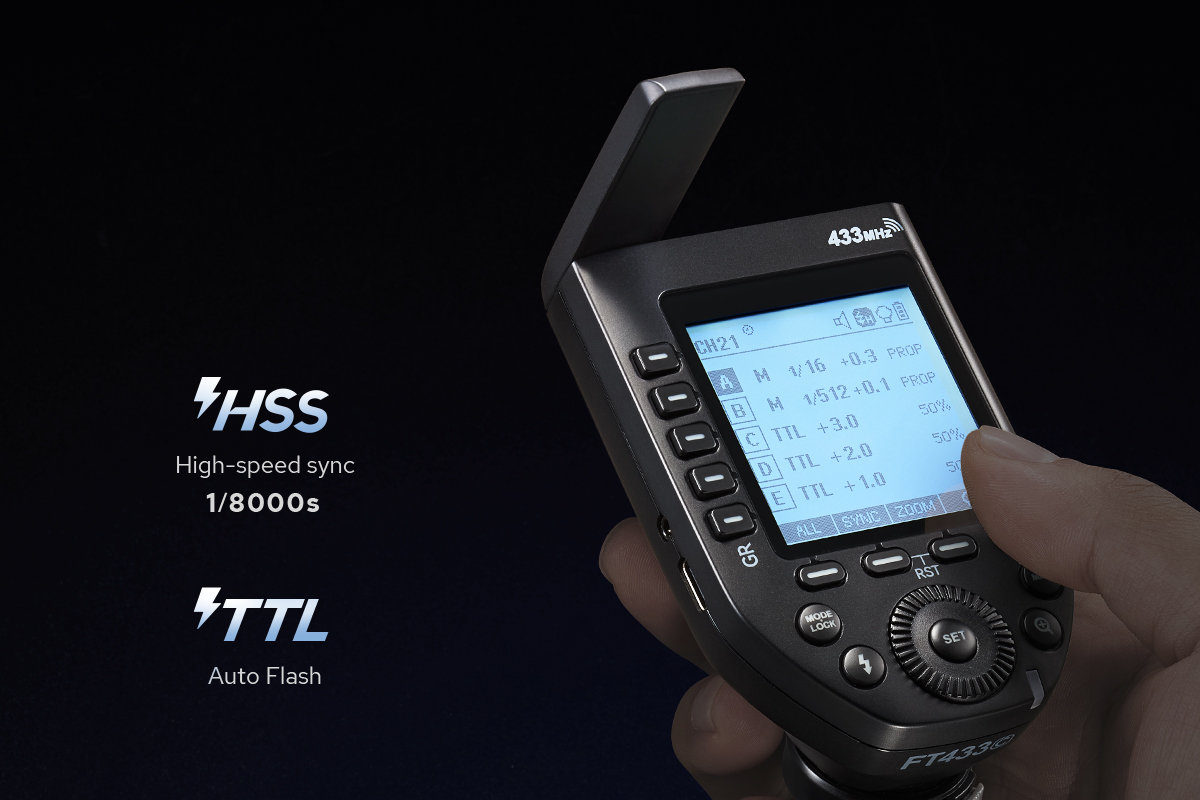 Achieve ultimate precision with the FT433 Trigger, offering comprehensive support for TTL auto flash, Manual, and Multi-flash modes. Unlock your professional-quality shots with features like High-Speed Sync (HSS) up to 1/8000s, front and rear curtain sync. The large, high-definition LCD screen, combined with 5 group buttons and 4 function buttons, ensures clear and intuitive parameter settings. Experience precision and versatility with the FT433 Trigger!