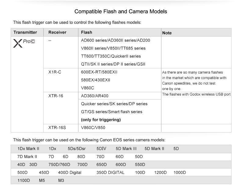 Compatible Camera List for Flash Trigger