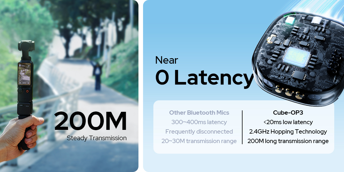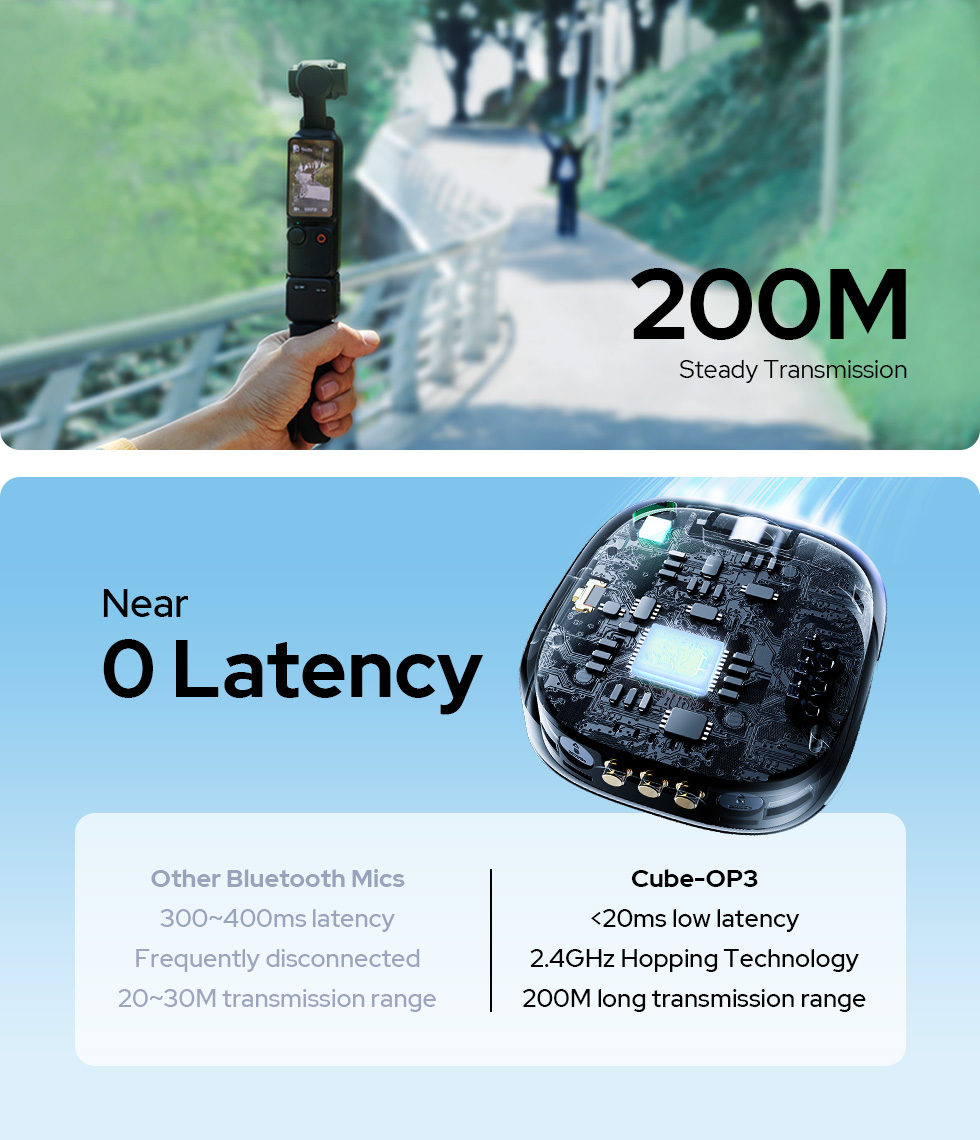 Engineered with a high gain antenna to enhance RF resistance, Cube-OP3 provides up to 200M (656ft.) transmission range with ≤24ms low latency, enabling stable recording across extended distances without worry about signal
