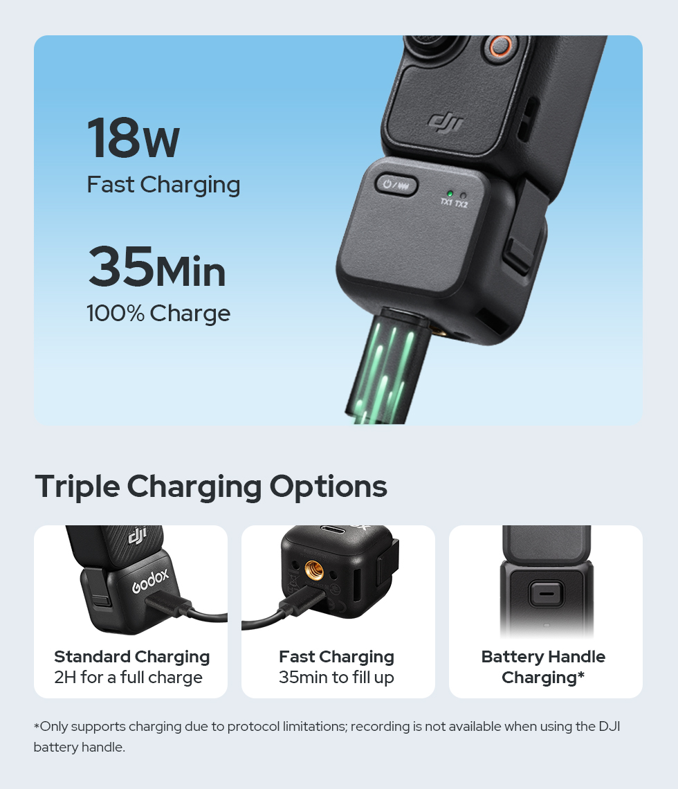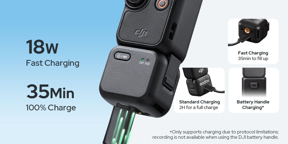 Strictly tested by Godox Audio Lab, Cube-OP3 RX is guaranteed with an advanced multi-protection system for ultimate safety. With 18W fast-charge support via Cube-OP3 RX, Pocket 3 reaches a full charge in just 35 minutes.