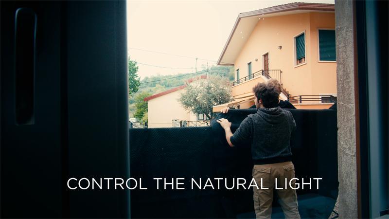 Do you find that window distracting? I certainly do. I don't want to see what's outside, and the incoming light can be a bit harsh. That's why we always carry a curtain with us. This curtain adds a diffusion layer to our simulated sun and makes the room feel more authentic.