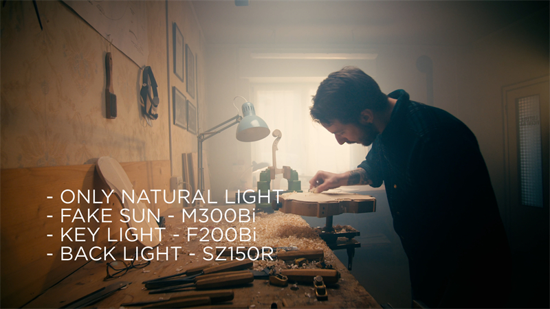 We'll position this light directly over Alberto to cast a soft glow on him, just a subtle touch. The color temperature is slightly cooler this time to create separation in the image. Placing the F200Bi above our artisan's head allows us to reduce the shadows created by the M300Bi on his desk because if we simply move this light to one side of Alberto, the resulting image would appear flat and uninteresting.