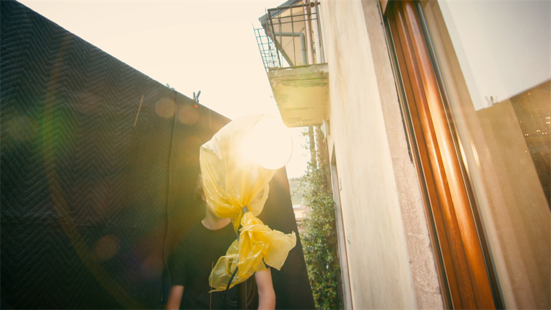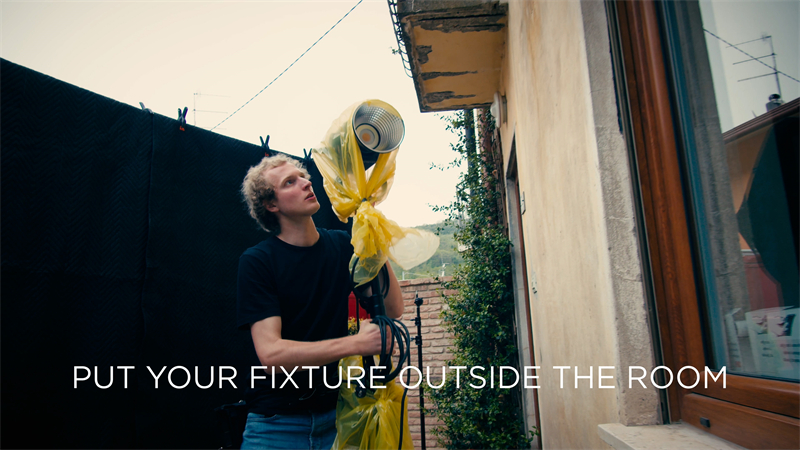 Additionally, it can be conveniently controlled via an app, which is perfect, especially when it's positioned at a distance. Our aim is not to directly illuminate Alberto with this light but to fill the room with a sun-setting effect on the horizon. Our gaffer, Tommaso, is now ready to turn on the M300Bi. In Italy, when we want the gaffer to turn on the light, we just shout, "Biascica, apri tutto! smarmella!" I find it quite poetic. Voilà! We now have our main light source.