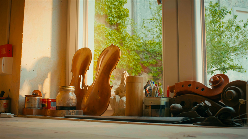 It's vital to find a balance between light and shadow, but we're not done yet. While Azzurra, our set designer for the day, works on making this place even more visually appealing, I have one more small concern. As you can see, the scene is still somewhat flat. We need to further distinguish the luthier from the background, and to achieve that, we require a backlight. We'll use the SZ150R and place it outside the workshop's door to cast light from there.